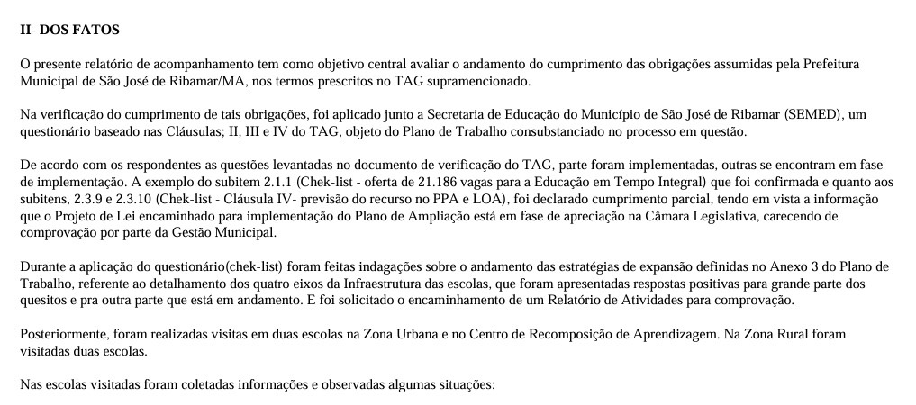 De acordo com relatório assinado pela auditora estadual Maria Irene Rabelo Pereira, as escolas não cumprem as 7 horas diárias de aula estabelecidas pelo Termo de Ajustamento de Gestão TAG nº 17/2024. A auditoria constatou que o turno da manhã soma apenas 5h15 e o da tarde 4h45, sem comprovação adequada das chamadas atividades complementares que deveriam completar a carga horária.