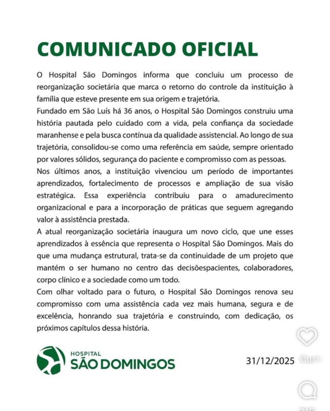 De acordo com a nota divulgada, o retorno do hospital às mãos dos fundadores tem como objetivo preservar o legado histórico da instituição, considerada uma das mais tradicionais da rede privada de saúde do Maranhão. A nova gestão afirma manter o foco no cuidado centrado nas pessoas, no respeito aos pacientes e na valorização dos profissionais de saúde, pilares que consolidaram o Hospital São Domingos como referência regional.