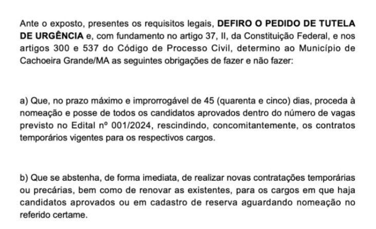 A Justiça do Maranhão determinou que o prefeito de Cachoeira Grande, César Castro, nomeie em até 45 dias todos os aprovados no concurso público de 2024 e demita contratados temporários para os mesmos cargos.